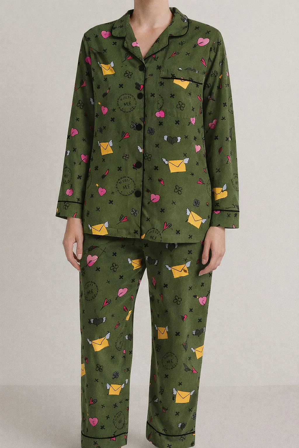 Add a touch of charm to your nights with our Blissful Heart pajamas. Featuring a lightweight linen fabric and a relaxed fit, this set combines elegance and comfort, making it perfect for unwinding or lounging in style.